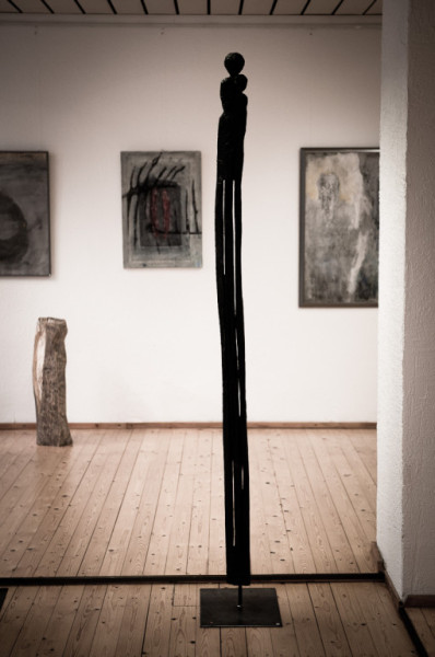 Bearbeitet mit Motorsäge und Beitel, geschwärzt mit Acrylfarbe.